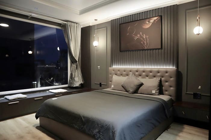 – 3 Phòng ngủ ấm cúng (Phòng đơn master, giường 1m8*2m, có mặt kính hướng ngắm hoàng hôn – Toilet riêng trong phòng, có bồn tắm; Phòng đơn ban công, giường 1m8*2m, ban công nhỏ thoáng mát; Phòng đơn, giường 1m6*2m, có ban công nhỏ thoáng mát)